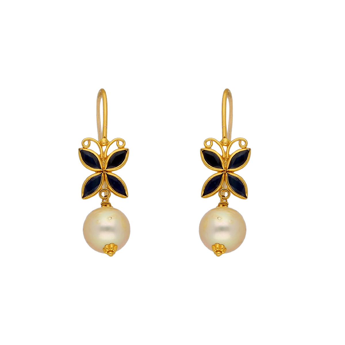 22KT Stud With Hanging Style Contemporary Gold EarringsProduct code:JPDEC-19-134Gold weight:1.56Stone weight:1.3Stone Name:South sea Pearls , Blue Sapphire Gold purity:22KTBrand:Sri Jagdamba Pearls Dealer