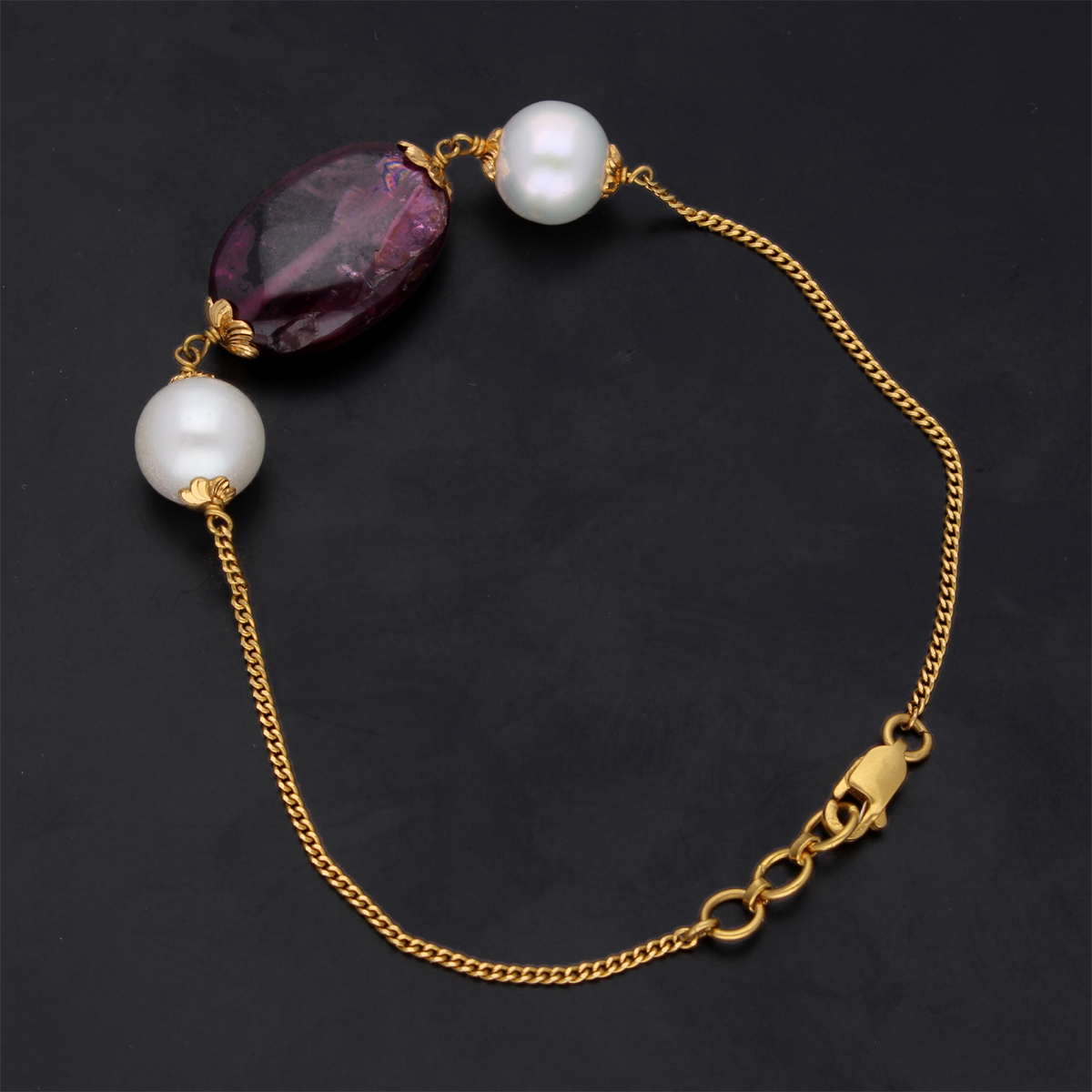 22KT Fusion Style Handcrafted Gold Bangles & BraceletsProduct code:JPMAR-20-140Gold weight:2.55Stone weight:16.5Stone Name:Freshwater Pearls , Colour Stones Gold purity:22KTBrand:Sri Jagdamba Pearls Dealer