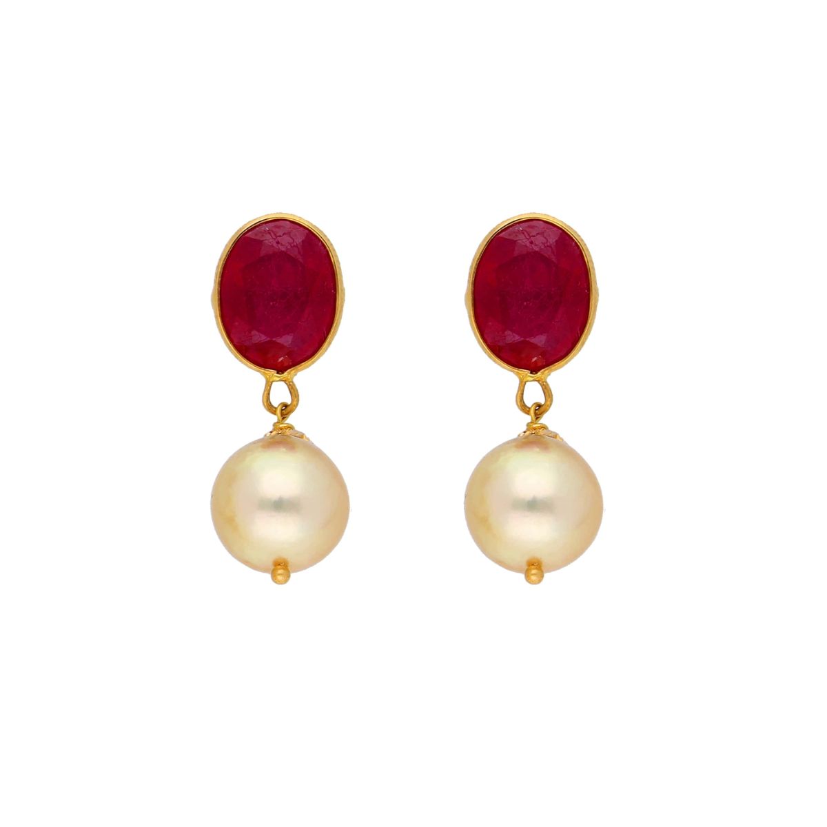22KT Studd With Hanging Style Contemporary Gold EarringsProduct code:JPDEC-19-209Gold weight:2.5Stone weight:7.6Stone Name:South sea Pearls , Ruby Gold purity:22KTBrand:Sri Jagdamba Pearls Dealer