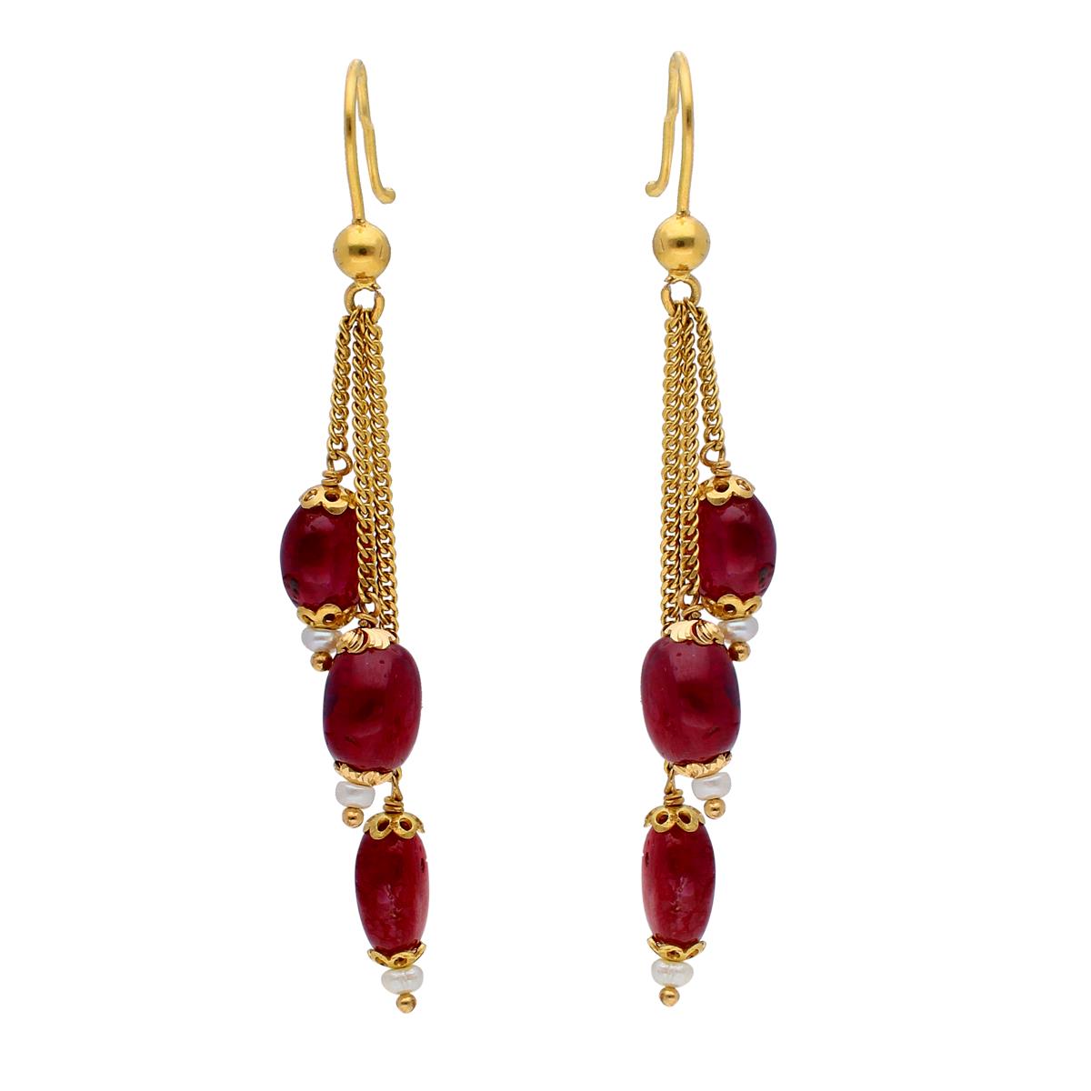 22KT Hangings Style Fusion Gold EarringsProduct code:JPJUL-19-313Gold weight:3.4Stone weight:26.4Stone Name: , Ruby Gold purity:22KTBrand:Sri Jagdamba Pearls Dealer