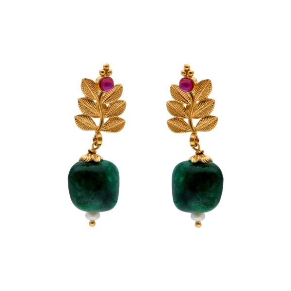 22KT Stud With Hanging Style Contemporary Gold EarringsProduct code:JPJUL-19-332Gold weight:2.835Stone weight:18.4Stone Name: , Beryl Emerald, Ruby Gold purity:22KTBrand:Sri Jagdamba Pearls Dealer