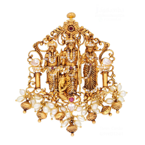 22KT Temple Style Religious Gold PendantsProduct code:JPAU-19-101Gold weight:26.816Stone weight:2.46Stone Name:Freshwater Pearls , Colour Stones Gold purity:22KTBrand:Sri Jagdamba Pearls Dealer