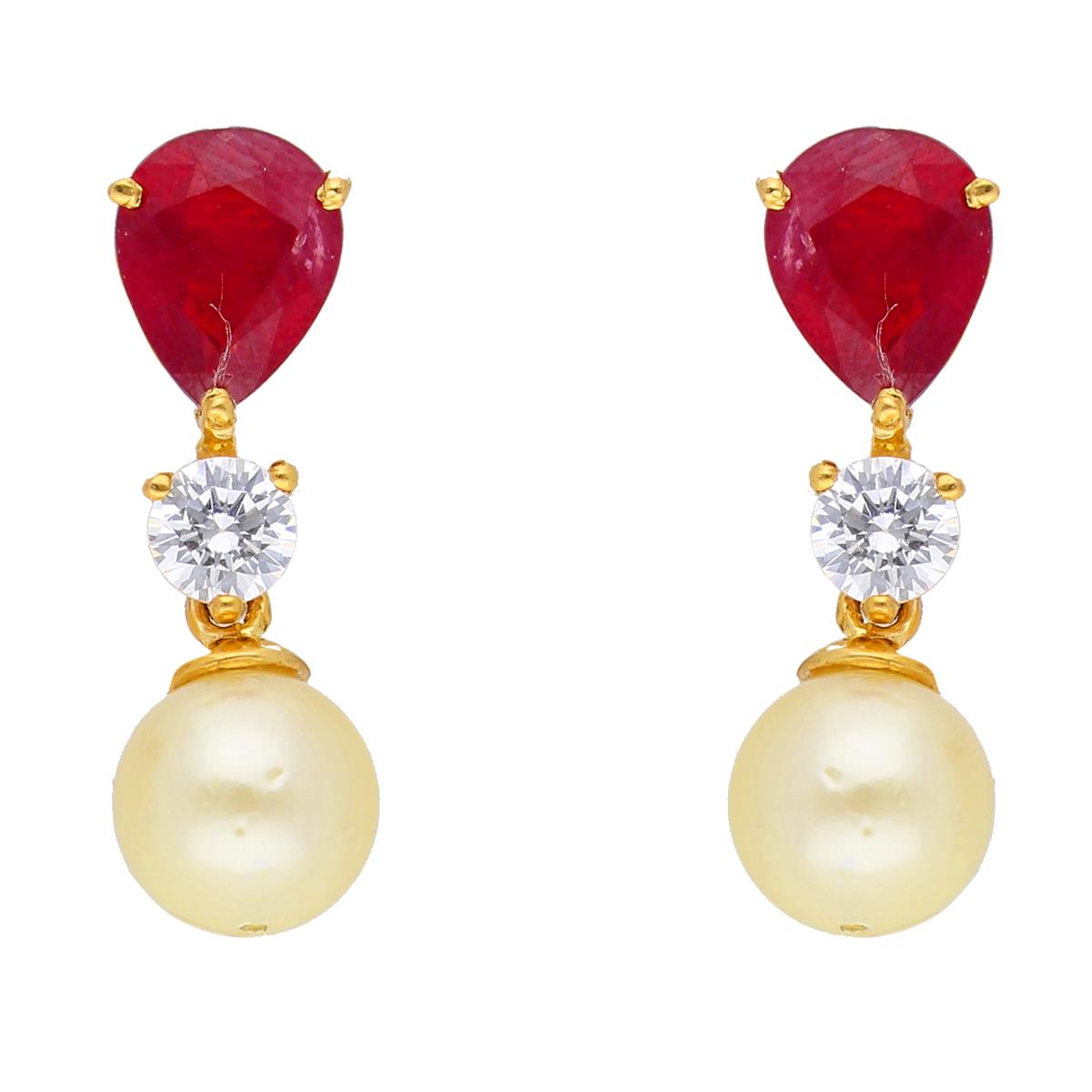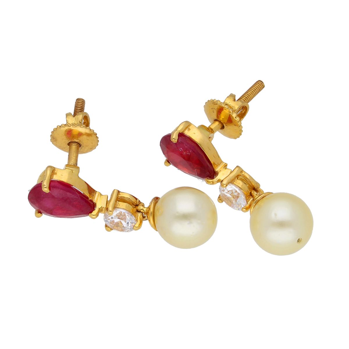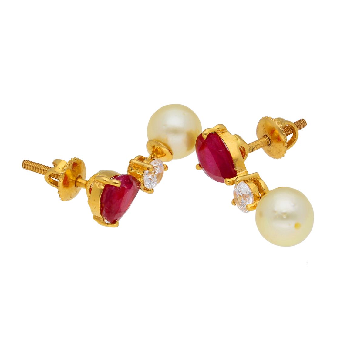 22KT Studd With Hanging Style Handcrafted Gold EarringsProduct code:JPJAN-20-42Gold weight:4.48Stone weight:5.6Stone Name:South sea Pearls , Cubic zirconia, Ruby Gold purity:22KTBrand:Sri Jagdamba Pearls Dealer