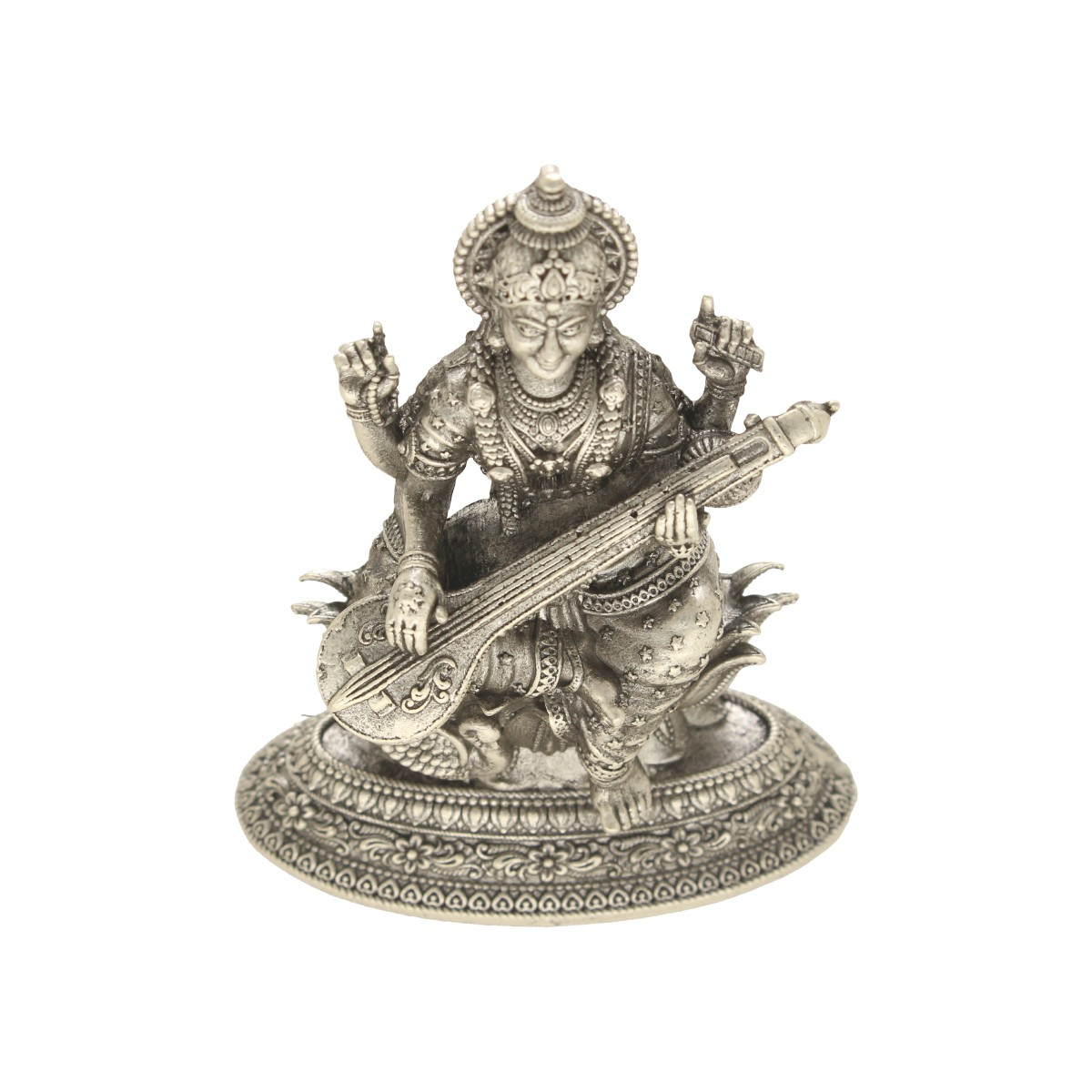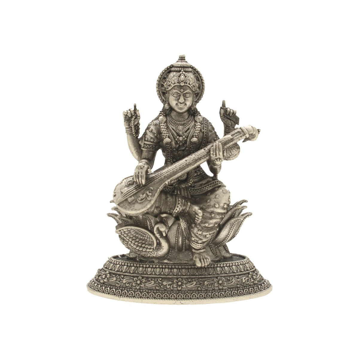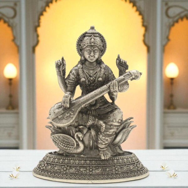 An intricately designed silver idol of Saraswati Devi, representing wisdom and knowledge.