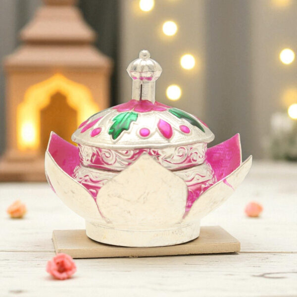 This silver kumkum box features a pink lotus design. It symbolizes purity and beauty in your rituals.