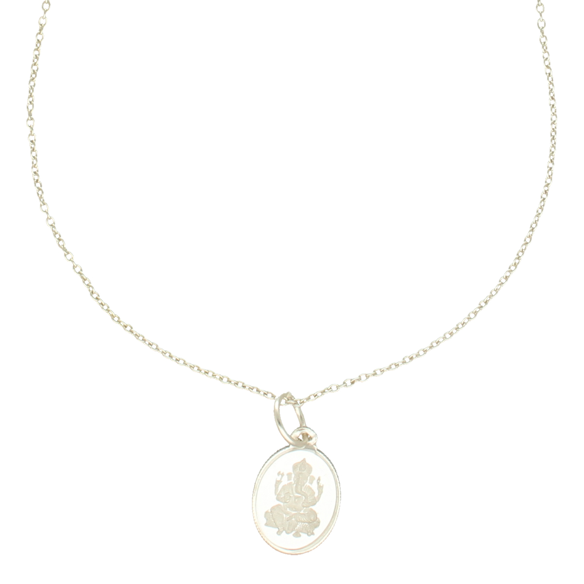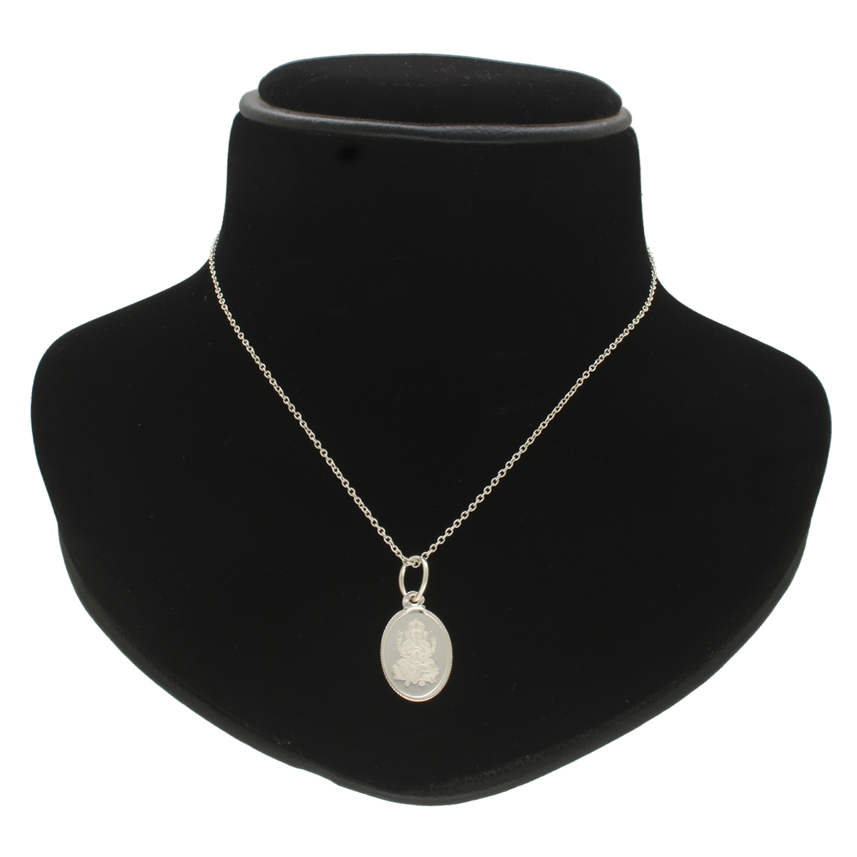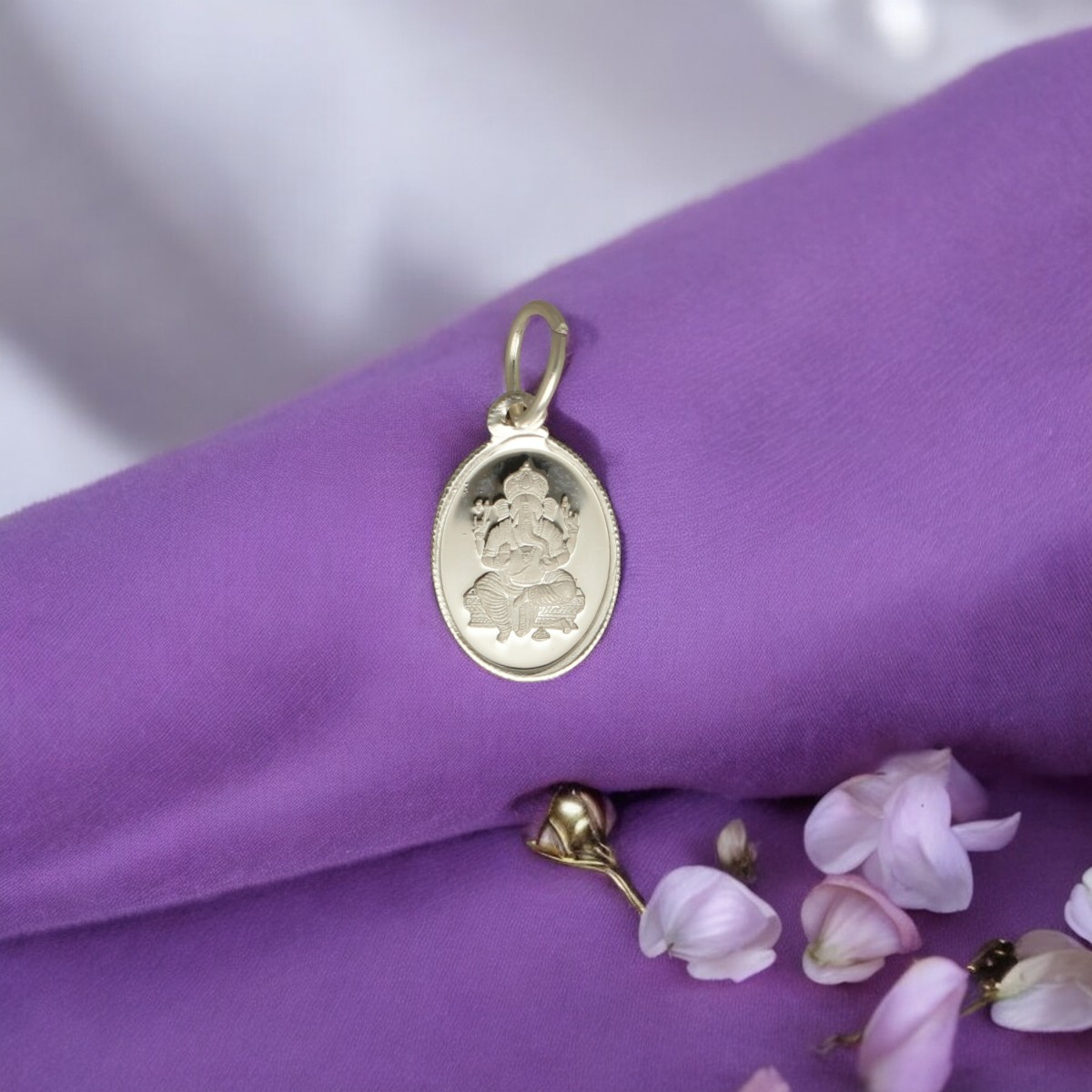 This 2 Grams Silver Ganesha Oval Pendant features a finely crafted depiction of Lord Ganesha, symbolizing wisdom and prosperity. The pendant is oval-shaped and comes with a sleek silver chain, making it a perfect accessory for daily wear or gifting. The lightweight design ensures comfort, while the high-quality silver adds a touch of elegance.