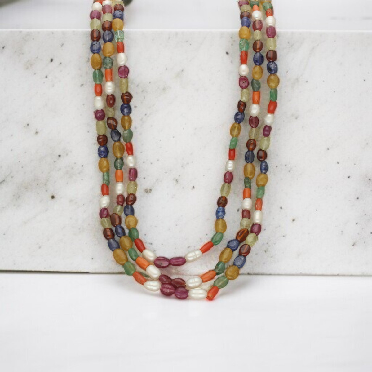 An ancient talisman reborn in modern elegance this Navratan necklace balances nine precious gemstones across three lines, channeling spiritual balance and royal legacy in every gleam.