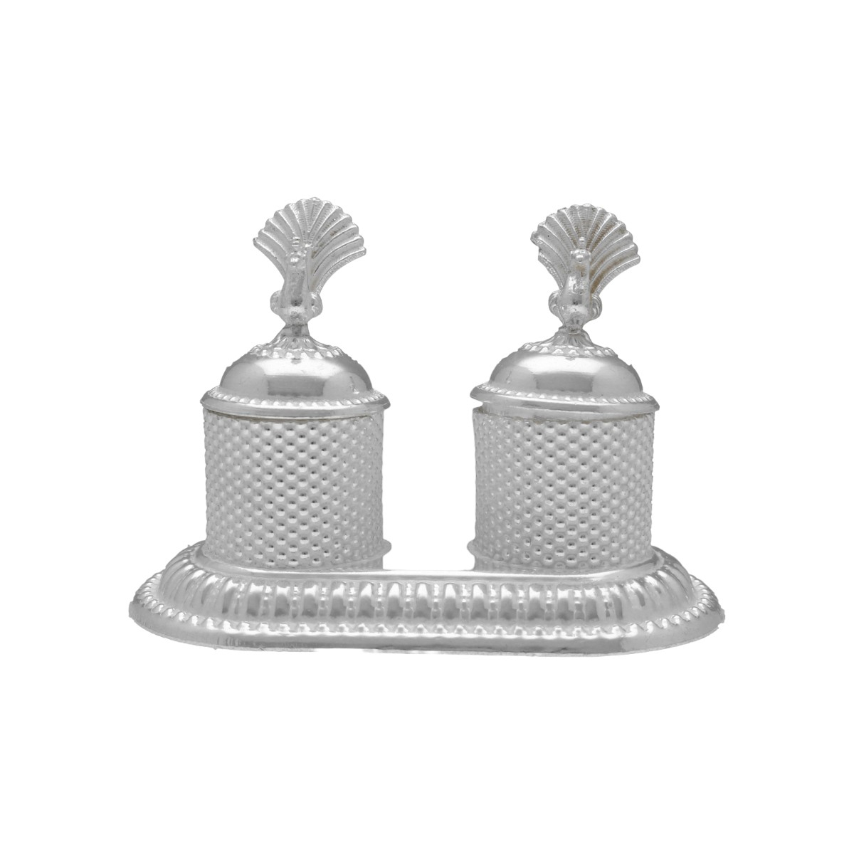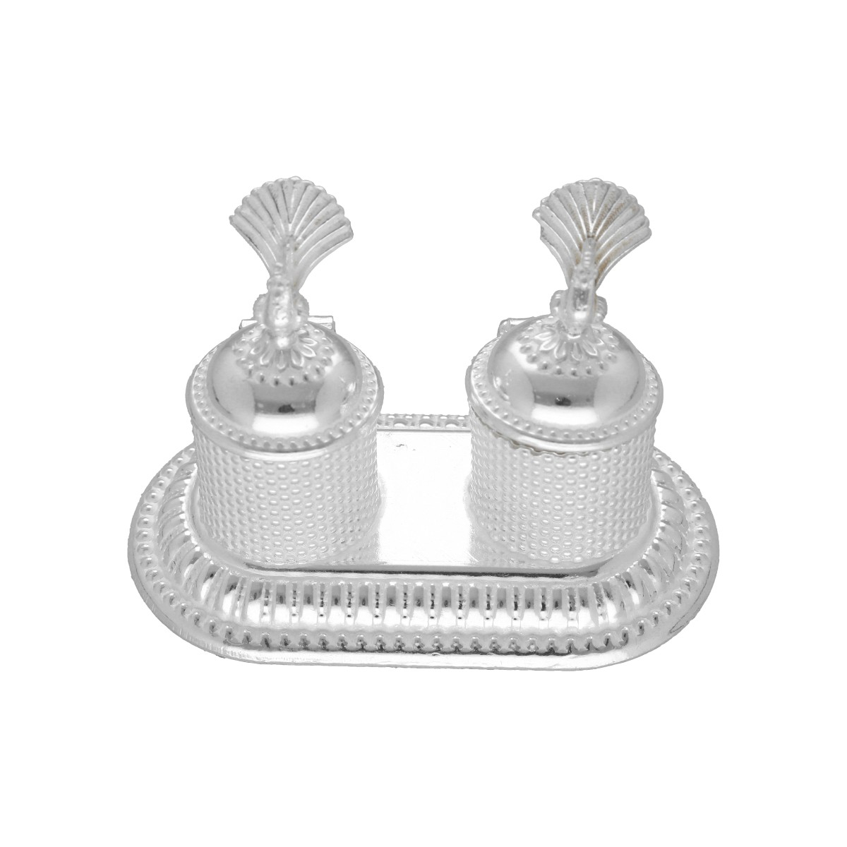This Haldi kumkum box features a charming peacock design. Its perfect for enriching your rituals.