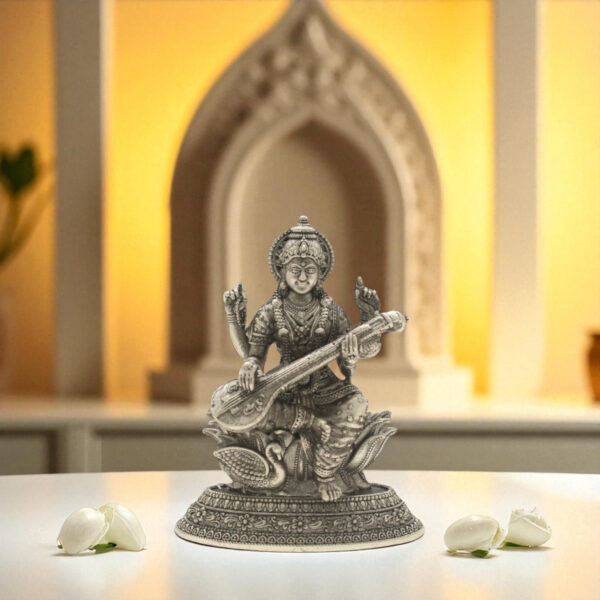 A charming miniature silver idol of Saraswati Devi, ideal for personal altars or gifts.
