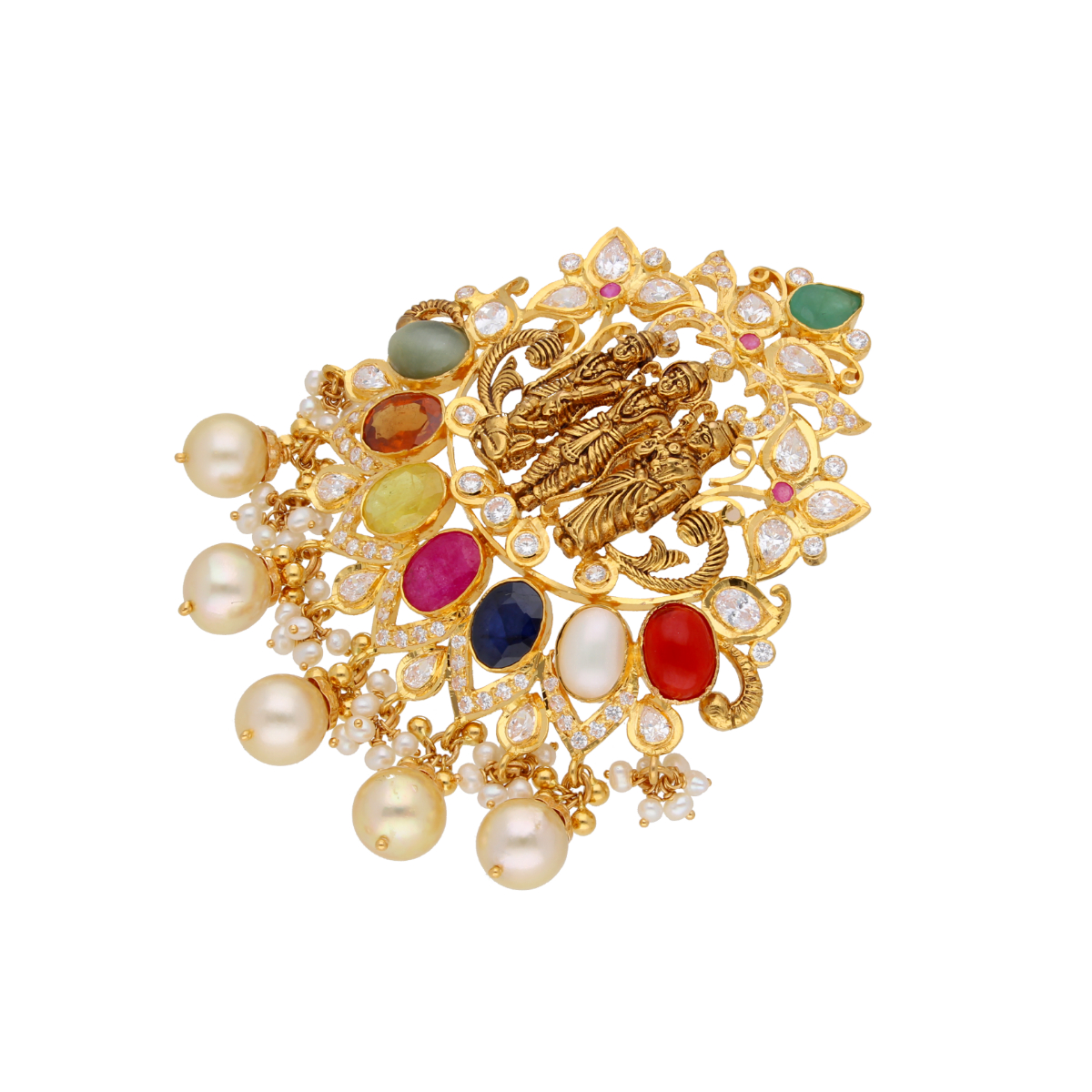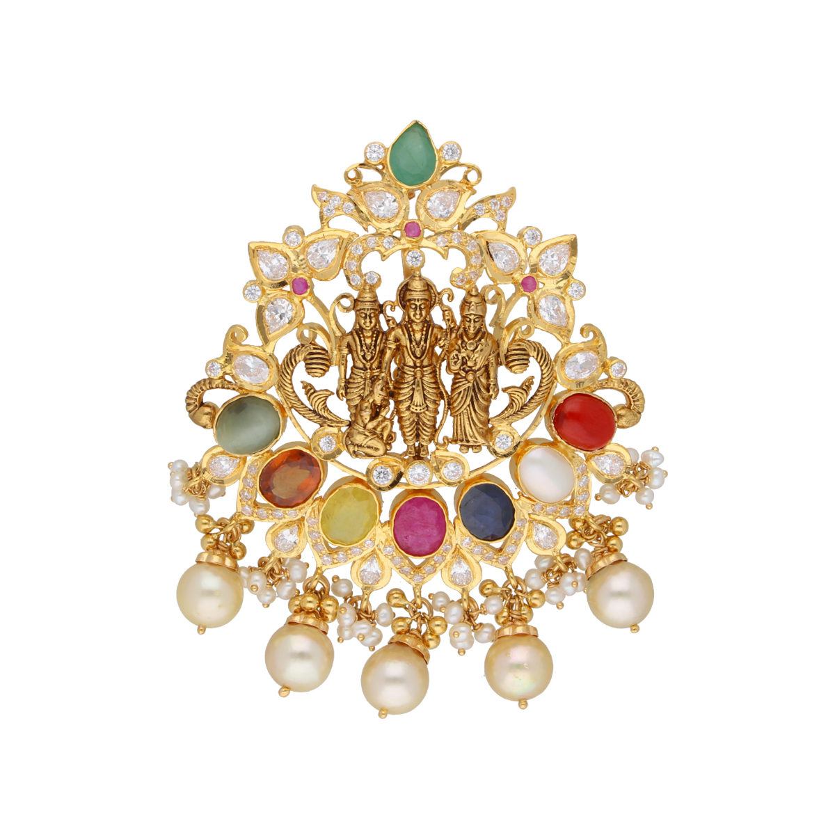 Gold PendantsProduct code:JPMAR-21-10Gold weight:23.15GramsStone weight:17.35CaratsStone Name:South Sea Pearls, Navratan, Cubic zirconia, Pearl Weight:19.45CaratGold purity:92.5 PurityBrand:Sri Jagdamba Pearls Dealer