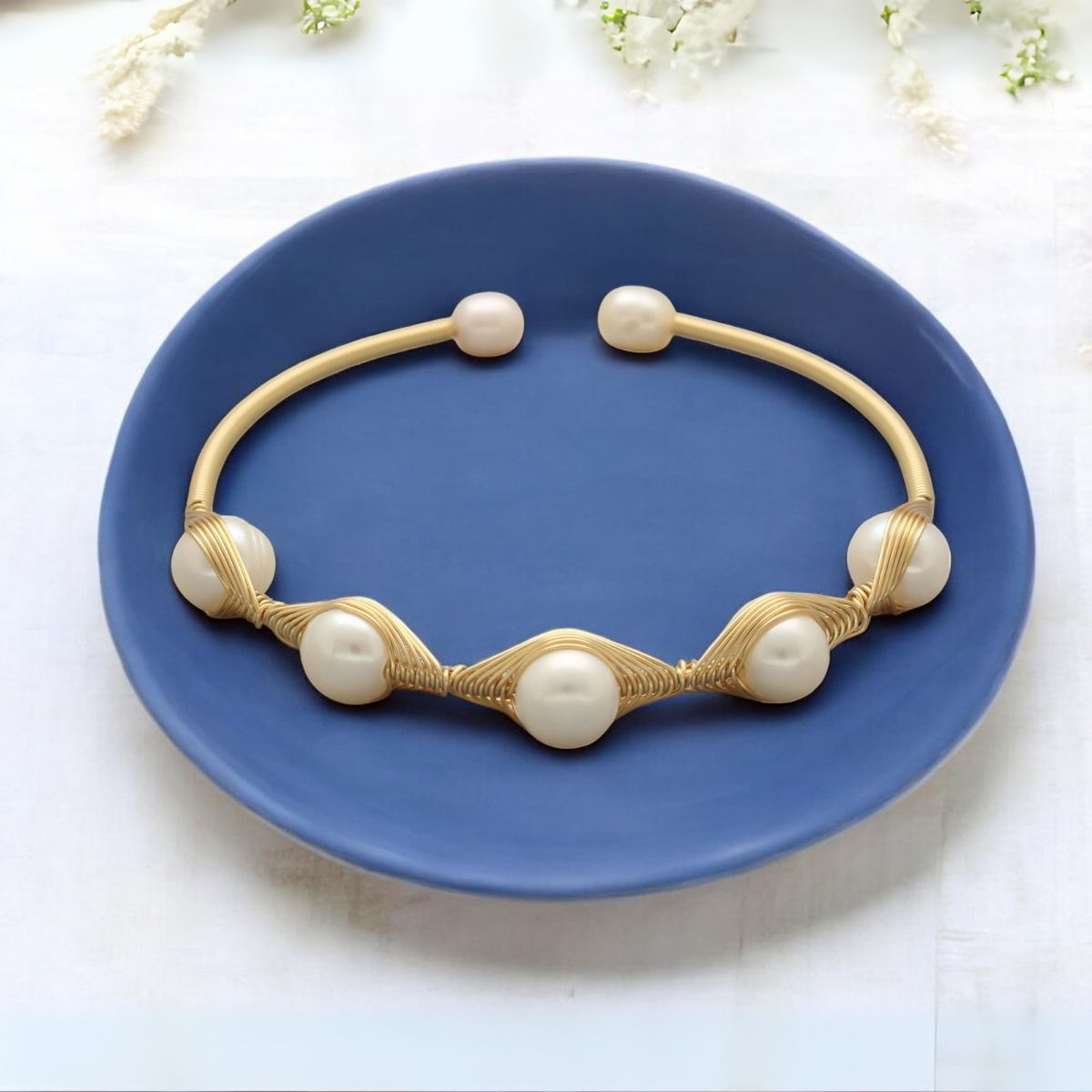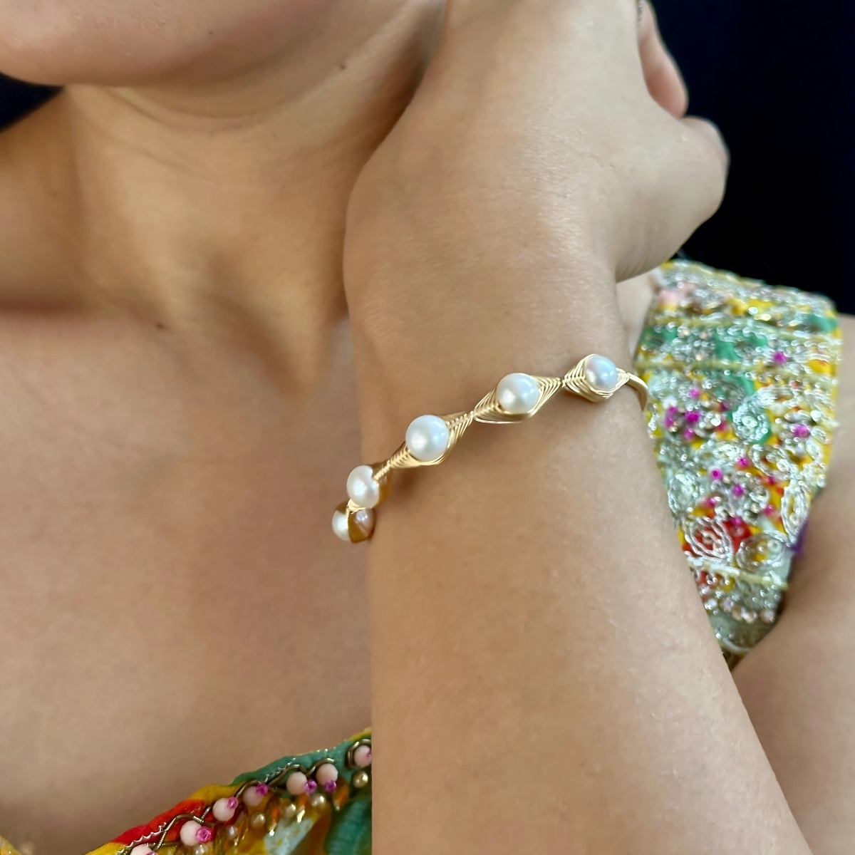 With its chic design and golden glow, this pearl bracelet is the perfect accessory for any occasion.