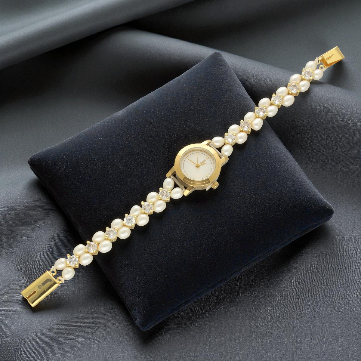 Ethereal shine meets sleek design. The Gleamira delivers pearl-powered sparkle in every tick, a chic essential for fashion-forward wrist styling.