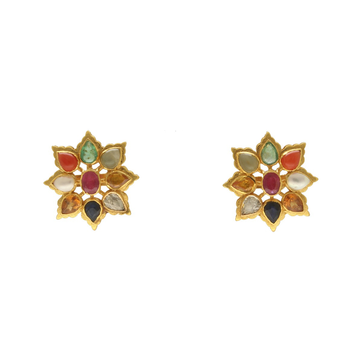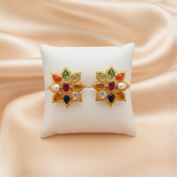 Bold yet elegant, The Haitya Navratan Gold Earrings are a dazzling tribute to royal Indian craftsmanship. The vibrant Navratna gemstones set against radiant gold create a mesmerizing play of color and light jewelry that tells a story of heritage and grace.