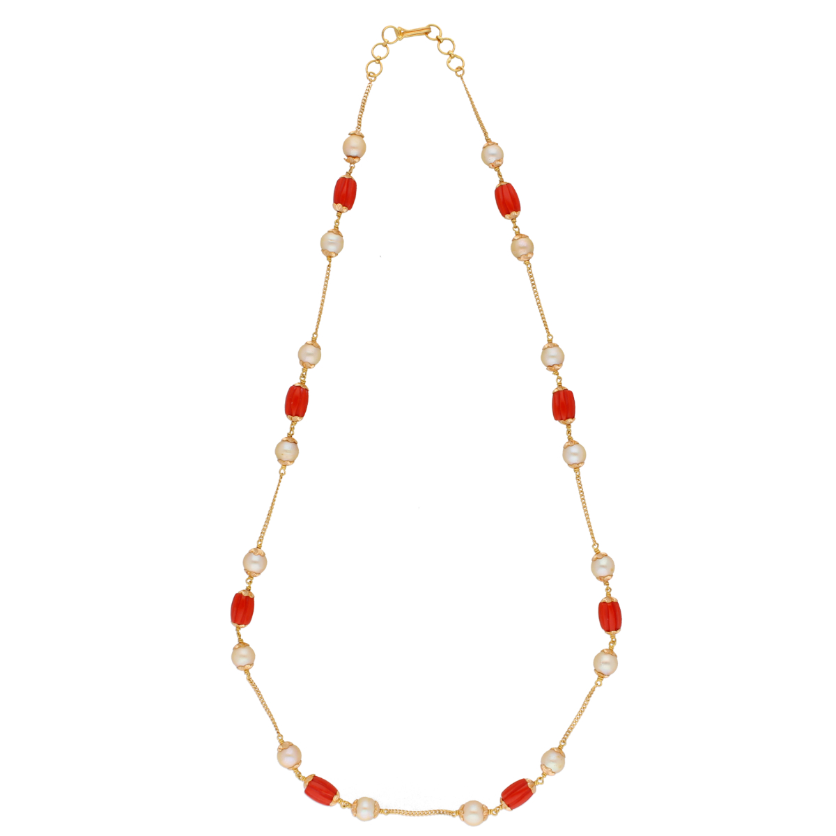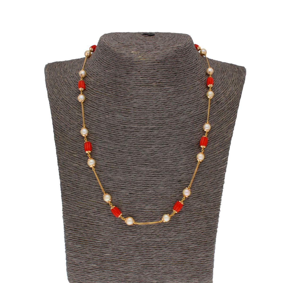 Jackie Gold Designer Gold ChainsProduct code: JPNOV-20-75Gold weight:8.1GramsStone weight:21.5CaratsStone Name:South Sea Pearls,Coral,,Pearl Weight:21.5CaratGold purity:22KTBrand:Sri Jagdamba Pearls Dealer