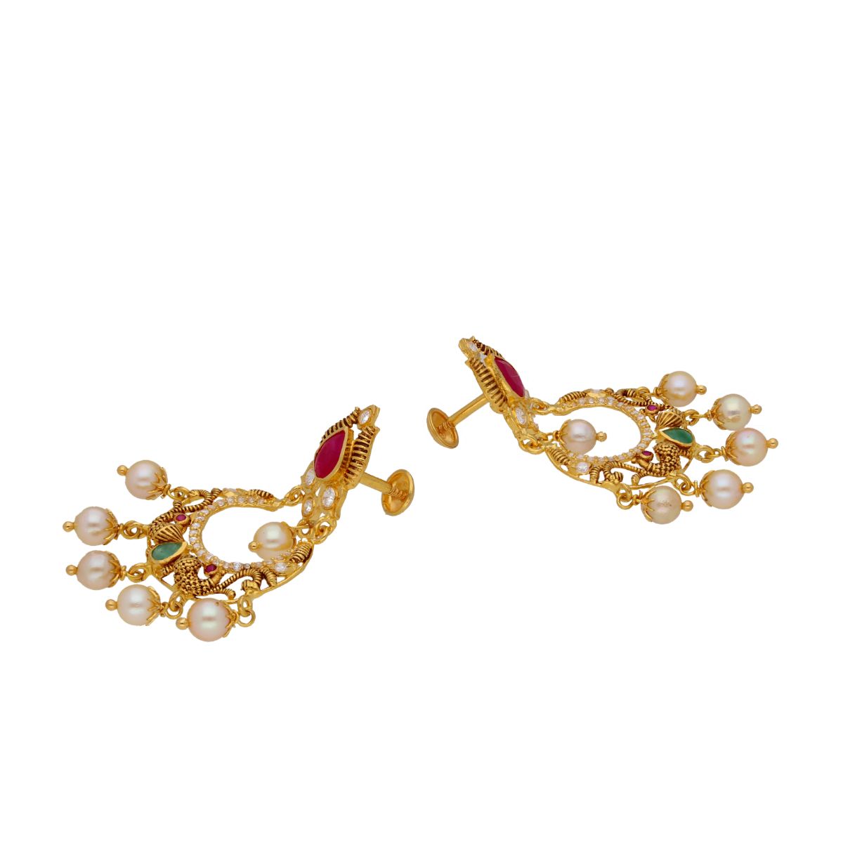 Kailey Gold EarringsProduct code: JPDEC-20-43Gold weight:12.51GramsStone weight:3.6CaratsStone Name:South Sea Pearls, Ruby, Emerald, Cubic zirconiaPearl Weight:12CaratGold purity:22KTBrand:Sri Jagdamba Pearls Dealer