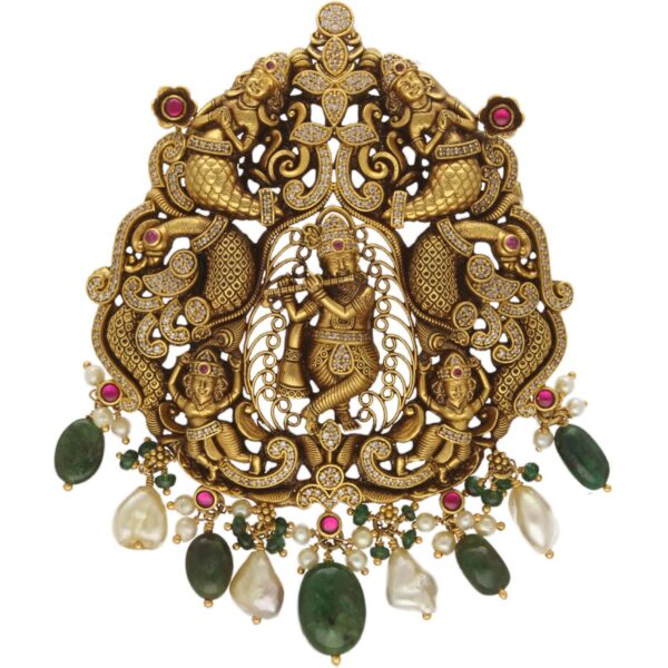 Lord Krishna 22kt Gold Cz Nakshi PendantPurity :22KT BisHallmark Gross Weight :38.725 Grams Net Weight :33.490 Grams Keshi Pearls And Emerald : 24.625 Carats Colour Stones : 1.550 Carats Stones : Emerald Beeds Pearls : Keshi Pearls
