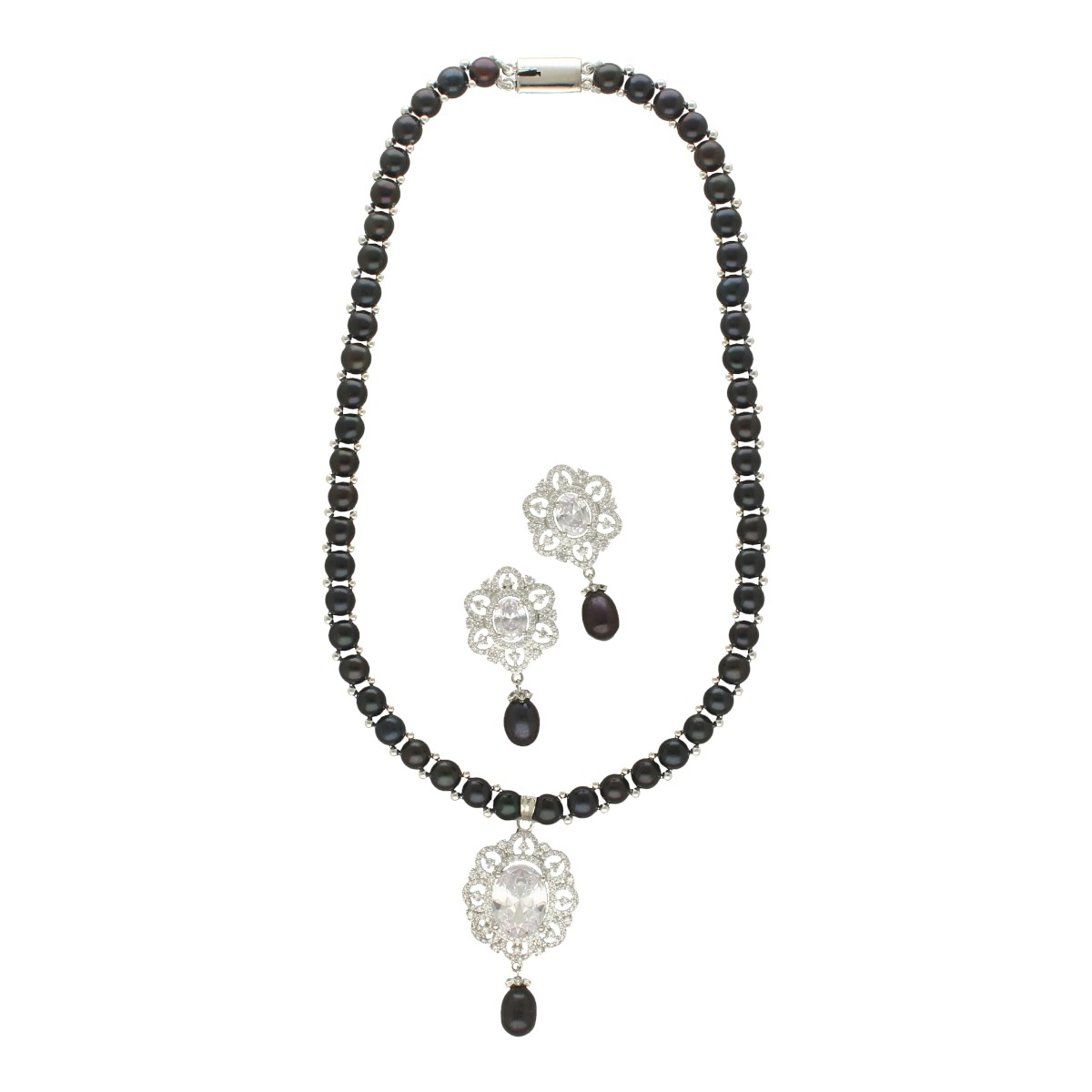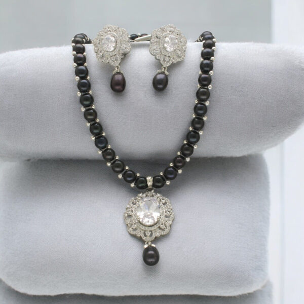 Illuminate your style with the Angel White CZ Pendant and Black Pearl Necklace Set, a stunning combination that merges sparkling cubic zirconia with the elegance of deep black pearls for a captivating look.