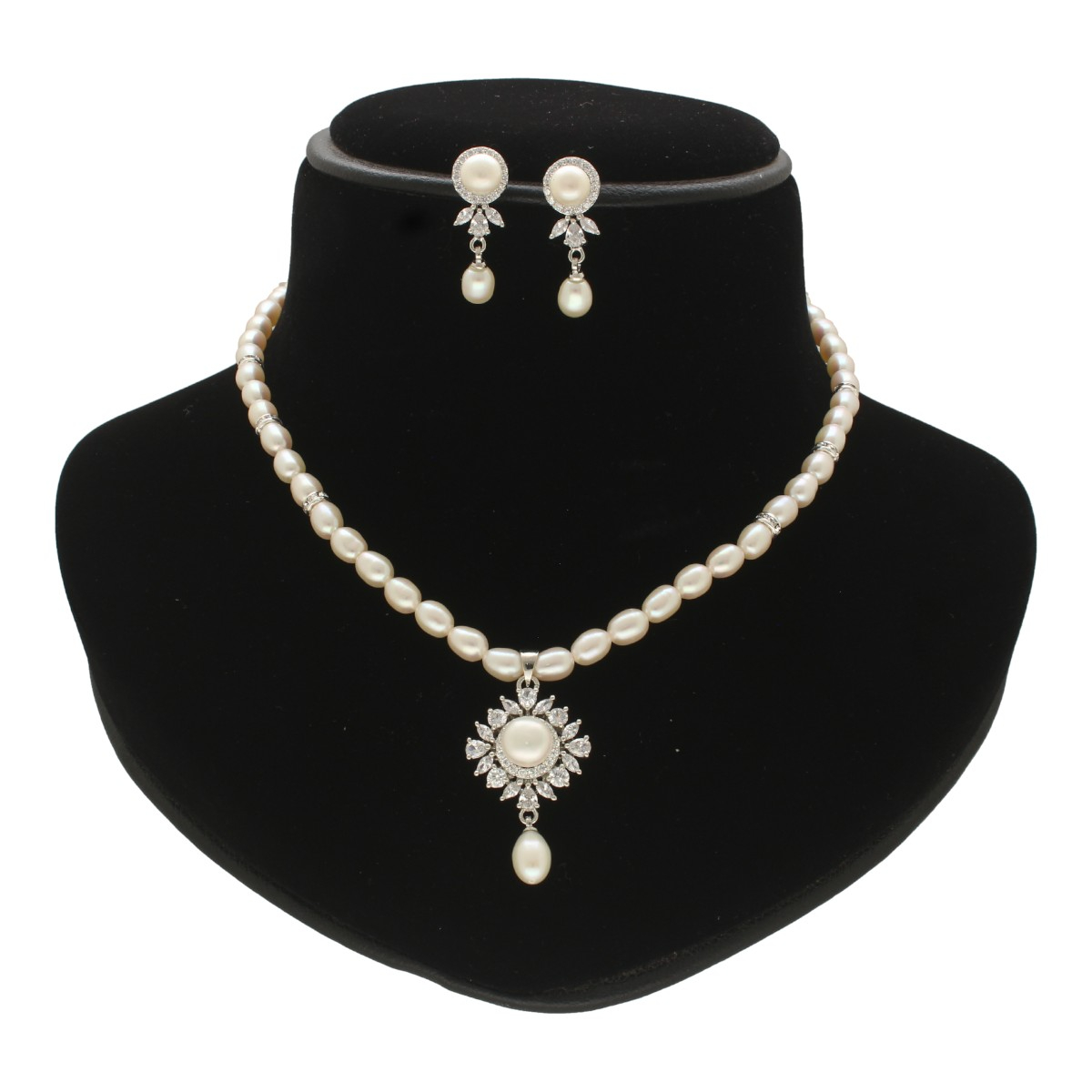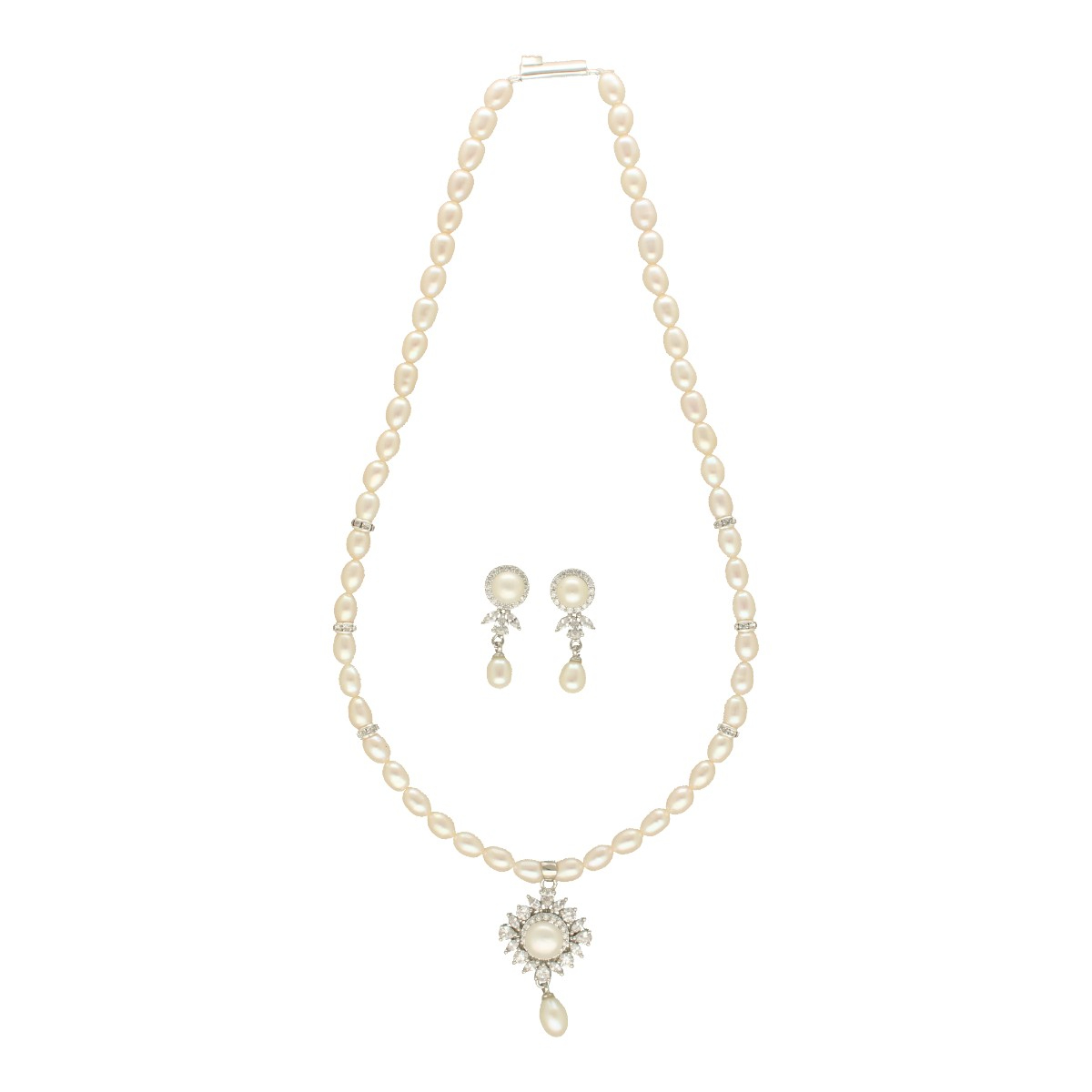 Enhance your elegance with this beautiful pearl necklace set, complemented by matching earrings that showcase timeless sophistication.