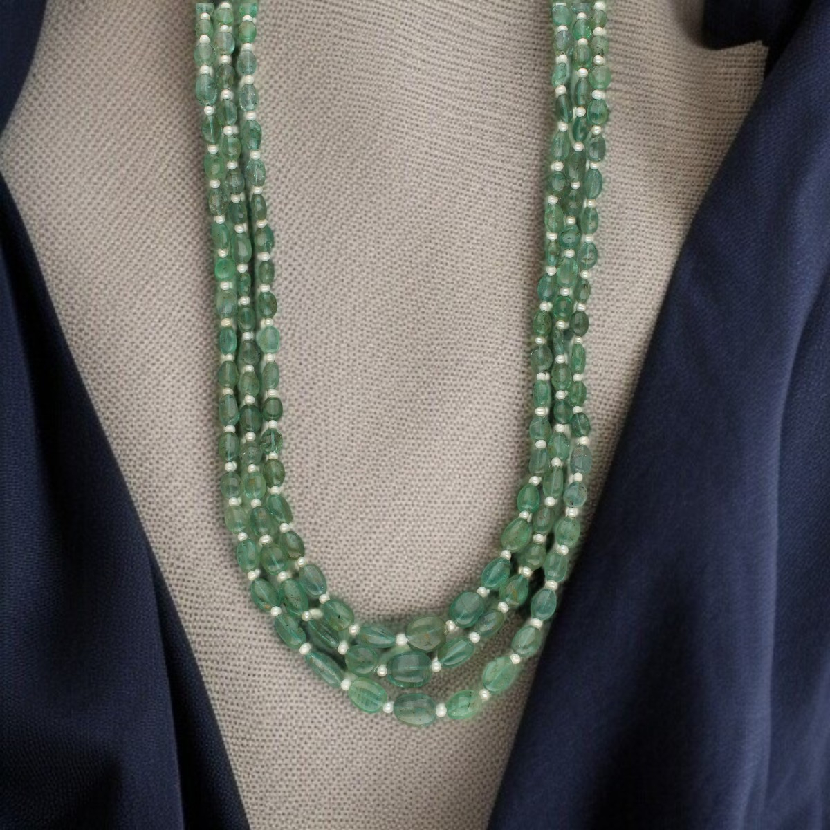 An embodiment of heritage and high taste, The Ethea necklace features three lines of rich green emeralds, each gem whispering tales of royalty, wisdom, and enduring beauty.