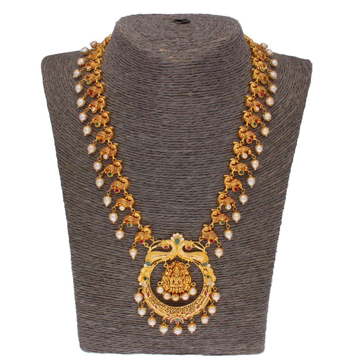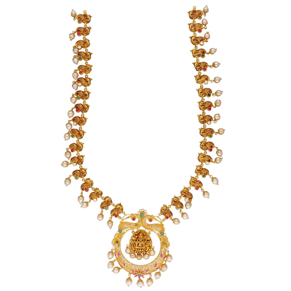 Winged Gold NecklaceProduct code: JPDEC-20-37Gold weight:40.09GramsStone weight:6.65CaratsStone Name:South Sea Pearls, Ruby, Emerald, Cubic zirconiaPearl Weight:46.4CaratGold purity:22KTBrand:Sri Jagdamba Pearls Dealer