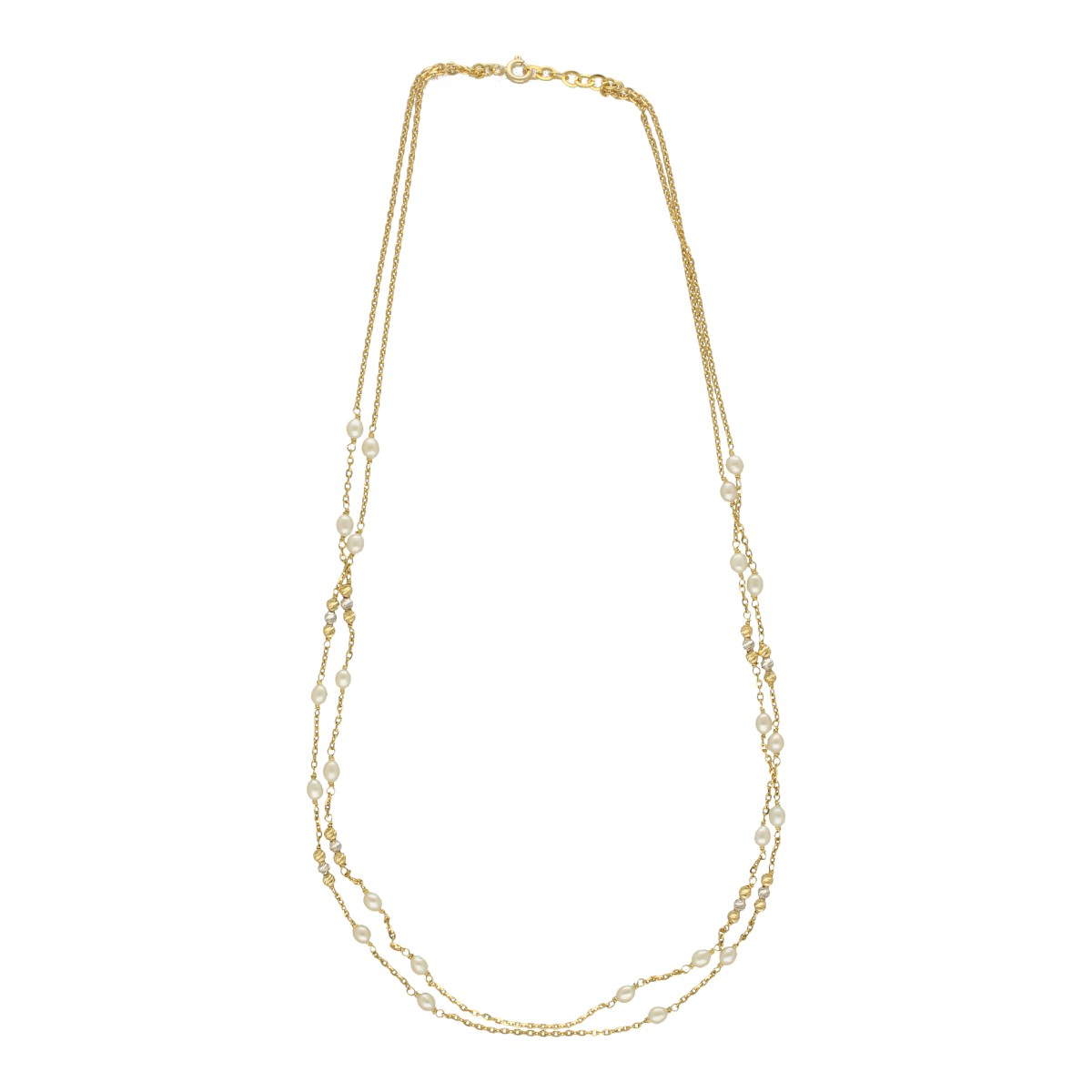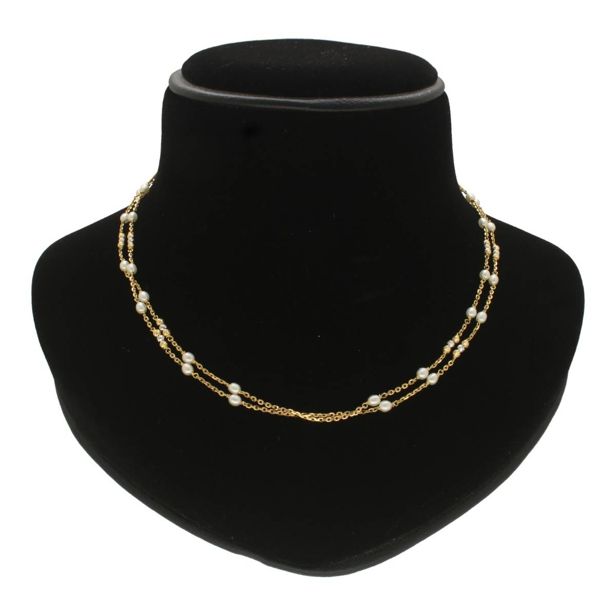Elevate your elegance with the Yami Dual Line 18Kt Gold Pearl Chain, a stunning interplay of shimmering gold and lustrous pearls that embodies refined sophistication.